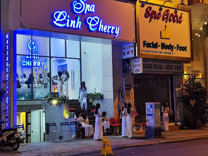 Linh Cherry Spa is a popular massage parlor in the “Little Tokyo” section of Ho Chi Minh City. The parlor has a large and prominent front wit big glass windows. There and on the street a bevy of beautiful Vietnamese women welcome in customers from the street. The ladies are so good looking that they act as a sort of human billboard for the place.